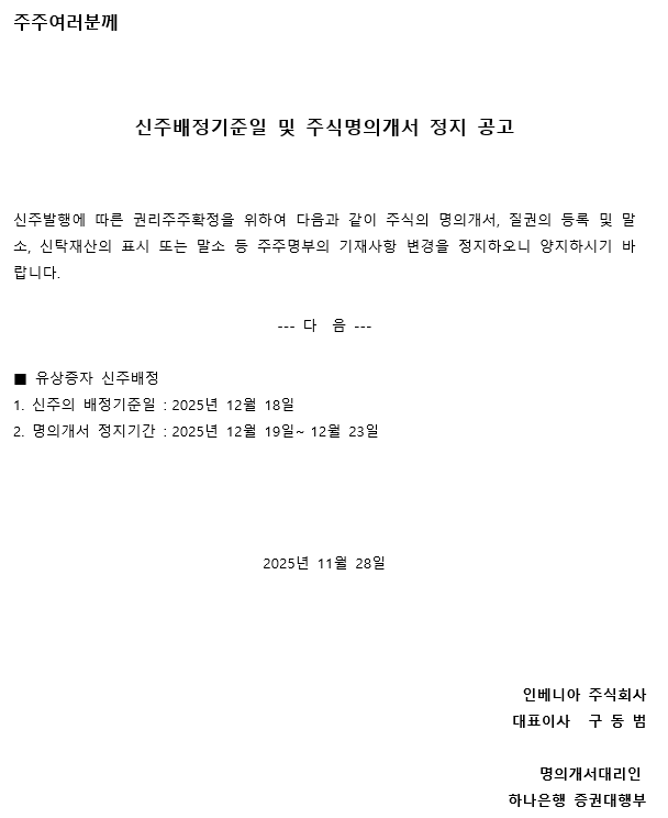 | 제목 | (정정)신주배정기준일 및 주식명의개서 정지 공고 | 등록일 | 2025-11-28 |